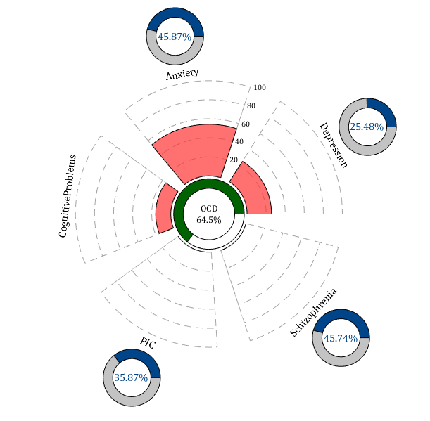 ابتدا، نمودار مرکزی را بررسی کند که احتمال تشخیص اصلی (در اینجا ۵۷.۲۹٪ برای OCD) را نشان می‌دهد. این مقدار به عنوان پایه تشخیص اولیه در نظر گرفته می‌شود.