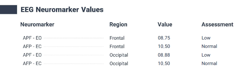 یکی از شاخص‌های کلیدی در تحلیل QEEG که می‌تواند اطلاعات ارزشمندی در مورد عملکرد مغزی ارائه دهد، Alpha Peak Frequency (APF) است. APF به فرکانس غالب در باند آلفا اشاره دارد که در EEG اندازه ‌گیری می‌شود و نشان ‌دهنده سرعت نوسانات مغزی در حالت استراحت است. این شاخص اغلب در شرایط چشمان بسته (Eyes Closed) و چشمان باز (Eyes Open) ارزیابی می‌شود و می‌تواند با عملکرد شناختی، توجه، و حالات عاطفی مرتبط باشد.