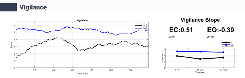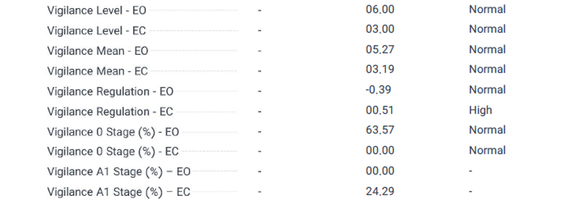 بر اساس داده‌های جدول EEG Neuromarker Values ، شاخص‌های هوشیاری در این بیمار مبتلا به   OCD  نشان‌دهنده الگوی ناهمگونی در سطح برانگیختگی است. به عنوان مثال، Vigilance Level-EO با مقدار 06.00 و Vigilance Mean-EO با مقدار 05.27 در محدوده "Normal" قرار دارند، اما کاهش APF در نواحی frontal در حالتEO ، پایین‌تر از نرمال و occipital در حالت EO می‌تواند به ناپایداری توجه و افزایش اضطراب مزمن مرتبط باشد، که با OCD سازگار است. این کاهش ممکن است به اختلال در تنظیم برانگیختگی قشری (cortical arousal) اشاره داشته باشد، که با افزایش فعالیت بتا در نواحی frontal با ارزش -0.18) نیز همخوانی دارد و نشان‌دهنده تلاش برای کنترل impuls است). همچنین، Vigilance Regulation-EC  با مقدار 00.51 (بالا) نشان‌دهنده ناپایداری در تنظیم هوشیاری است، که با علائم وسواسی مانند نشخوار فکری و کاهش آرام‌سازی مغزی در نواحی posterior  مرتبط است.