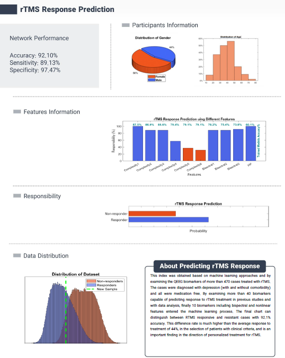 صفحه پیش‌ بینی پاسخ rTMS در گزارش‌های QEEGhome با استفاده از نورومارکرها به بررسی احتمال پاسخ بیمار به این درمان می‌پردازد. این صفحه، که بر پایه الگوریتم‌های یادگیری ماشین آموزش ‌دیده بر داده‌های QEEG توسعه یافته، دقت بالایی ارائه می‌دهد (33).