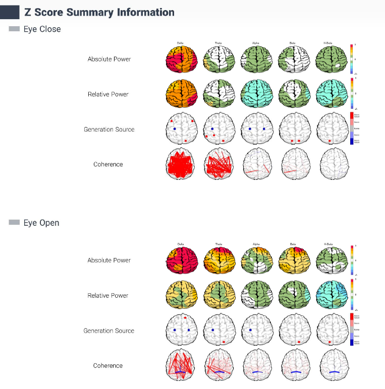 بخش Z-Score Information در گزارش‌ها، نمایانگر انحراف استاندارد فعالیت امواج مغزی در باندهای فرکانسی (دلتا، تتا، آلفا، بتا و های‌بتا) نسبت به یک پایگاه داده نرمال (پایگاه داده QEEGhome که تماما از افراد ایرانی سراسر کشور جمع آوری شده است) است و در دو حالت چشمان بسته (EC) و چشمان باز (EO) ارزیابی می‌شود. نقشه‌های توپوگرافیک با رنگ‌های مختلف (آبی برای انحرافات پایین‌تر، قرمز برای انحرافات بالاتر از نرمال) شدت این انحرافات را در نواحی مختلف مغز نشان می‌دهند. بخش Absolute Power قدرت مطلق امواج را و Relative Power درصد هر باند فرکانسی نسبت به کل فعالیت مغزی را نمایش می‌دهد. نقاط مشخص‌شده (مانند قرمز و آبی) نشان‌دهنده منابع تولید (Generation Source) هستند که انحرافات قابل‌توجه را برجسته می‌کنند. این مارکر به شناسایی الگوهای غیرطبیعی، مانند افزایش دلتا در OCD، کمک می‌کند و برای تشخیص افتراقی و برنامه‌ریزی درمانی مفید است.