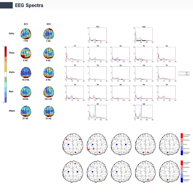 صفحه EEG Spectra در گزارش‌ها، طیف توان QEEG با محاسبه چگالی طیفی توان در باندهای فرکانسی دلتا (0.5-4 هرتز)، تتا (4-8 هرتز)، آلفا (8-13 هرتز)، بتا (13-30 هرتز) و بتا بالا (20-30 هرتز) از طریق تبدیل سریع فوریه (FFT) روی دوره‌های 2-4 ثانیه‌ای EEG، توزیع قدرت سیگنال‌های مغزی را نشان می‌دهد. در این گزارش، نقشه‌های توپوگرافیک اوج توان هر باند را نمایش می‌دهند (مثل توان دلتا در 1 هرتز با تأکید فرونتال و آلفا در 10.5 هرتز با غالبیت پس‌سری)، در حالی که نمودارهای خطی الکترودها (مثل FP1، F7) تغییرات توان را بر حسب فرکانس (0-30 هرتز) به صورت لگاریتمی نشان می‌دهند. تغییرات این الگو ها با بیماری های مختلف روانپزشکی نسبت مستقیم دارند و همچنین این الگوها توان، انحرافات احتمالی از هنجارهای سنی را برجسته کرده و برای تحلیل اختلالات مغزی و کمک به تشخیص و همچنین برنامه‌ریزی درمانی کاربرد دارند.
