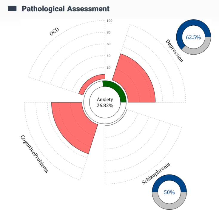 برای استفاده از این صفحه، روانپزشک میتواند به شرح زیر عمل کند: ابتدا، نمودار مرکزی را بررسی کند که احتمال تشخیص اصلی (در اینجا ۲۶.۸۲٪ برای اضطراب) را نشان میدهد. این مقدار به عنوان پایه تشخیص اولیه در نظر گرفته میشود. سپس، دایرههای جانبی را تحلیل کند که احتمال تشخیصهای افتراقی (مانند MDD با ۶۲.۵٪ یا اسکیزوفرنی با ۵۰٪) را نشان میدهند. در نمودار همبودیها، قطاعهای صورتی شدت و احتمال همزمانی علائم را نشان میدهند: برای مثال در این نمودار «OCD» کمترین سهم را دارد و بار همبودیِ کمی را نمایش میدهد. در قطاع دیگر نمودار depression مشاهده میشود که در حدود 40 الی 50 درصد همبودی را نشان میدهد که قابل توجه است. آنالیز دادههای این بیمار همچنان ریسک مشکلات شناختی در حد 45 درصد نشان میدهد که میتواند زنگ خطر برای بیماریهای شناختی در آینده باشد و میتواند پزشک را در رابطه با تحت نظر قرار دادن بیمار برای جلوگیری از بیماریهای شناختی در آینده گوش به زنگ نگه دارد.