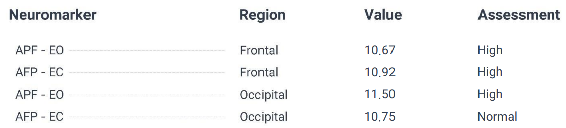 یکی از شاخصهای کلیدی در تحلیل QEEG که میتواند اطلاعات ارزشمندی در مورد عملکرد مغزی ارائه دهد، Alpha Peak Frequency (APF) است. APF به فرکانس غالب در باند آلفا اشاره دارد که در EEG اندازهگیری میشود و نشاندهنده سرعت نوسانات مغزی در حالت استراحت است. این شاخص اغلب در شرایط چشم بسته (Eyes Closed) و چشم باز (Eyes Open) ارزیابی میشود و میتواند با عملکرد شناختی، توجه، و حالات عاطفی مرتبط باشد.