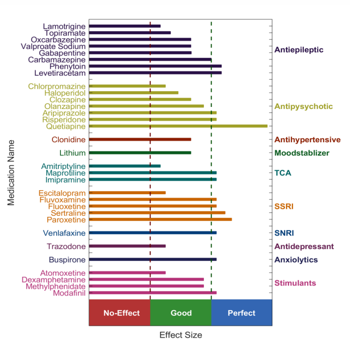 در نمودار ارائهشده توسط QEEGhome، داروها بر اساس دستهبندیهای مختلف (مانند Antiepileptic، Antipsychotic، Mood stabilizer، TCA، SSRI، SNRI، Antidepressant، Anxiolytics و Stimulants) با مقیاس افقی از "No-effect" (سمت چپ، نشاندهنده عدم پاسخ یا مقاومت) به "Good" (وسط، پاسخ متوسط) و "Perfect" (سمت راست، پاسخ عالی) نمایش داده شدهاند.