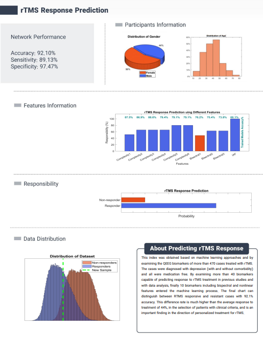 در ادامه بررسی ابزارهای پیشرفته در گزارشهای QEEGhome برای مدیریت اضطراب، به صفحه پیشبینی پاسخ به rTMS (Repetitive Transcranial Magnetic Stimulation) میرسیم. ابتدا لازم است توضیح دهیم که rTMS چیست. rTMS یک روش درمانی غیرتهاجمی است که از میدانهای مغناطیسی پالسی برای تحریک مستقیم نواحی خاص مغز استفاده میکند. در این روش، یک کویل مغناطیسی روی پوست سر قرار میگیرد و پالسهای مغناطیسی کوتاهمدت تولید میشود که جریان الکتریکی خفیف بدون نیاز به جراحی یا بیهوشی در نورونهای قشر مغز ایجاد میکند. این تحریک میتواند فعالیت عصبی را تعدیل کند، مانند افزایش یا کاهش اتصالپذیری در مدارهای مغزی، و اغلب برای درمان اختلالات روانپزشکی مانند افسردگی مقاوم، اضطراب و OCD به کار میرود. نحوه عملکرد آن بر پایه اصل تحریک تکراری است که میتواند ، به عنوان مثال با هدف قرار دادن نواحی مانند amygdala یا prefrontal cortex در اضطراب، که با تنظیم پاسخهای عاطفی و hyperarousal مرتبط هستند پلاستیسیته عصبی را تغییر دهد (38). rTMS به عنوان یک درمان شناختهشده برای اضطراب (به ویژه اضطراب comorbid با افسردگی) ، در سالهای ۲۰۲۱ و ۲۰۲۲ توسط FDA (اداره غذا و دارو ایالات متحده) برای درمان افسردگی با همآیندی اضطراب تایید شد، و اخیراً در ۲۰۲۴ برای anxious depression تأییدیههای جدیدی دریافت کرده است (39). این تأیید بر اساس مطالعات بالینی است که نشاندهنده کاهش قابل توجه علائم اضطرابی در بیماران مقاوم به درمانهای استاندارد (مانند SSRIها یاCBT) هستند، با نرخ پاسخ حدود ۳۰-۵۰ درصد در برخی تحقیقات است (40). صفحه پیشبینی پاسخ rTMS در گزارشهای QEEGhome با استفاده از مارکرهای خطی و غیرخطی به بررسی احتمال پاسخ بیمار به این درمان میپردازد. این صفحه، که بر پایه الگوریتمهای یادگیری ماشین آموزشدیده و با دادههای QEEG توسعه یافته، دقت بالایی ارائه میدهد (مانند دقت ۹۲.۱۰٪، حساسیت ۹۲.۱۳٪ و specificity ۹۷.۴۷٪ در مدلهای ارزیابیشده). پزشک با استفاده از این صفحه، در کنار علائم بالینی بیمار (مانند شدت نگرانی مداوم، حملات پانیک، همآیندیها مانند افسردگی یا OCD) و شرایط کلی (مانند سن، تاریخچه پزشکی و دسترسی به تجهیزات)، میتواند در رابطه با ادامه درمان با rTMS تصمیمگیری کند. برای مثال، اگر پیشبینی نشاندهنده پاسخدهی بالا باشد (مانند Responder در نمودار)، پزشک میتواند rTMS را به عنوان گزینه اصلی پیشنهاد دهد، در حالی که در موارد non-responder، به سمت درمانهای جایگزین مانند داروهای augmentation یا نوروفیدبک حرکت کند. این رویکرد شخصیسازیشده، بر اساس شواهد QEEG، نرخ موفقیت درمان را افزایش میدهد و از هزینههای غیر ضروری جلوگیری میکند.